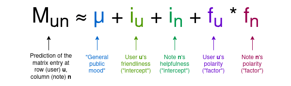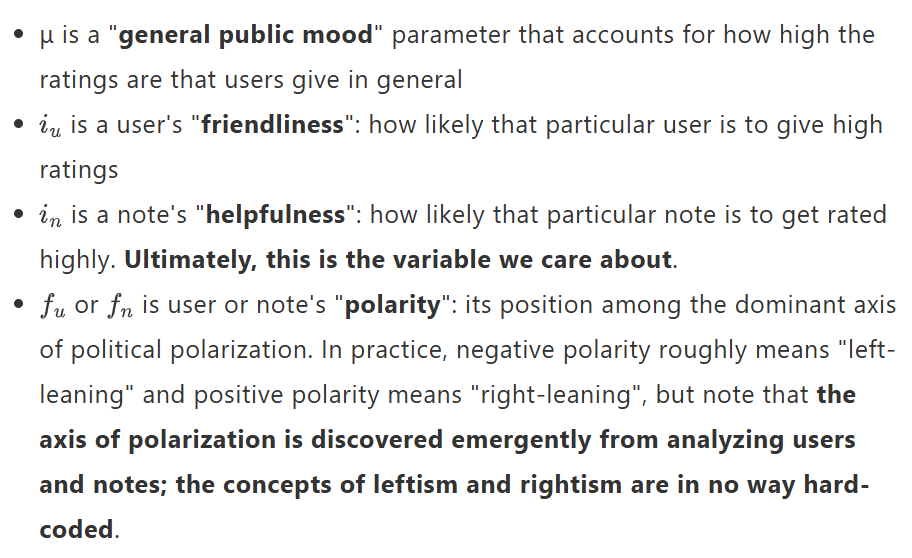 Well, how do you decide if a user is doing a good enough job rating or writing notes? Community Notes is driven by a complex computational model in which a note is deemed good if it is rated positively “from people across a diverse range of perspectives.” Well, what does that mean? I’m glad you asked. Essentially, the algorithm computes a score for each note based on some complex formulas. Buterin puts it in terms of this equation: