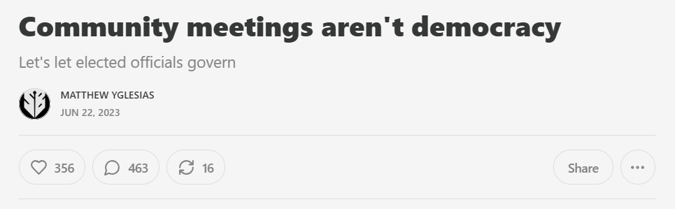 So what’s my point? My point is that when advocates prefer one policy framework over another, they should point to the actual values they prefer to trade off on rather than just claiming that their preferred framework is more “democratic.” This is not just a semantic distinction. The fact of the matter is that Walter Lippmann was right in the most important sense: all projects today that require public input cannot run without experts; indeed, it is the experts who will always be figuring out the broad and little details of a policy. When the term “democratic” is used in a vibes sense3 to signal some kind of public participation, it gives off the sense that the real conflict here is between the public and the experts. But it isn’t. If there is a fight, there are regular people and experts on both sides. When we use the term “democratic” in the sense that this framework gives more power to the people, we are just setting it up for failure and delegitimation down the road.